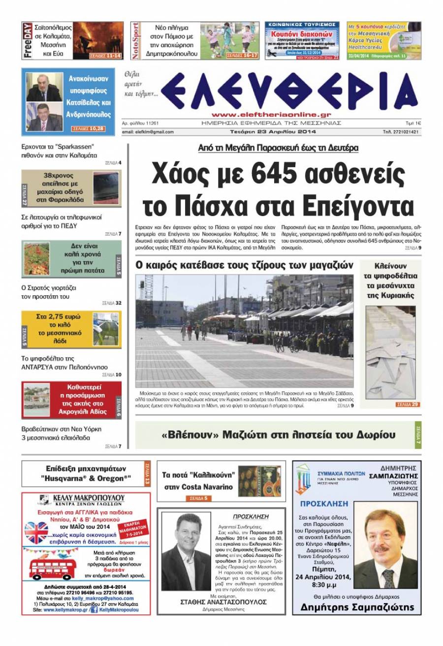 Το πρωτοσέλιδο της "Ελευθερίας" της Tετάρτης 23 Απριλίου 2014 Για να κατεβάσετε το αρχείο πατήστε πάνω στο κουμπί που γράφει download pdf