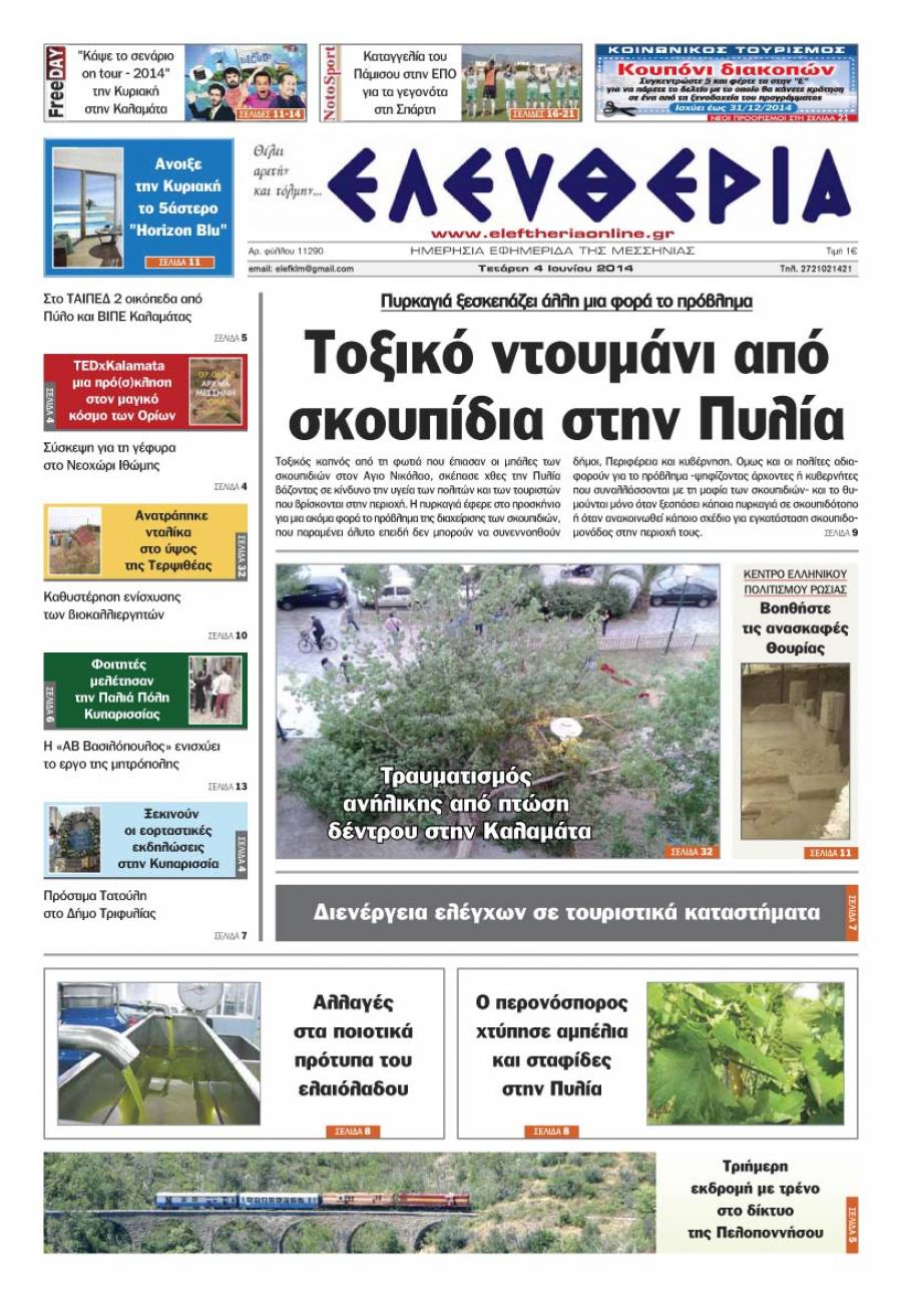 Το πρωτοσέλιδο της "Ελευθερίας" της Τετάρτης 4 Ιουνίου 2014 Για να κατεβάσετε το αρχείο πατήστε πάνω στο κουμπί που γράφει download pdf