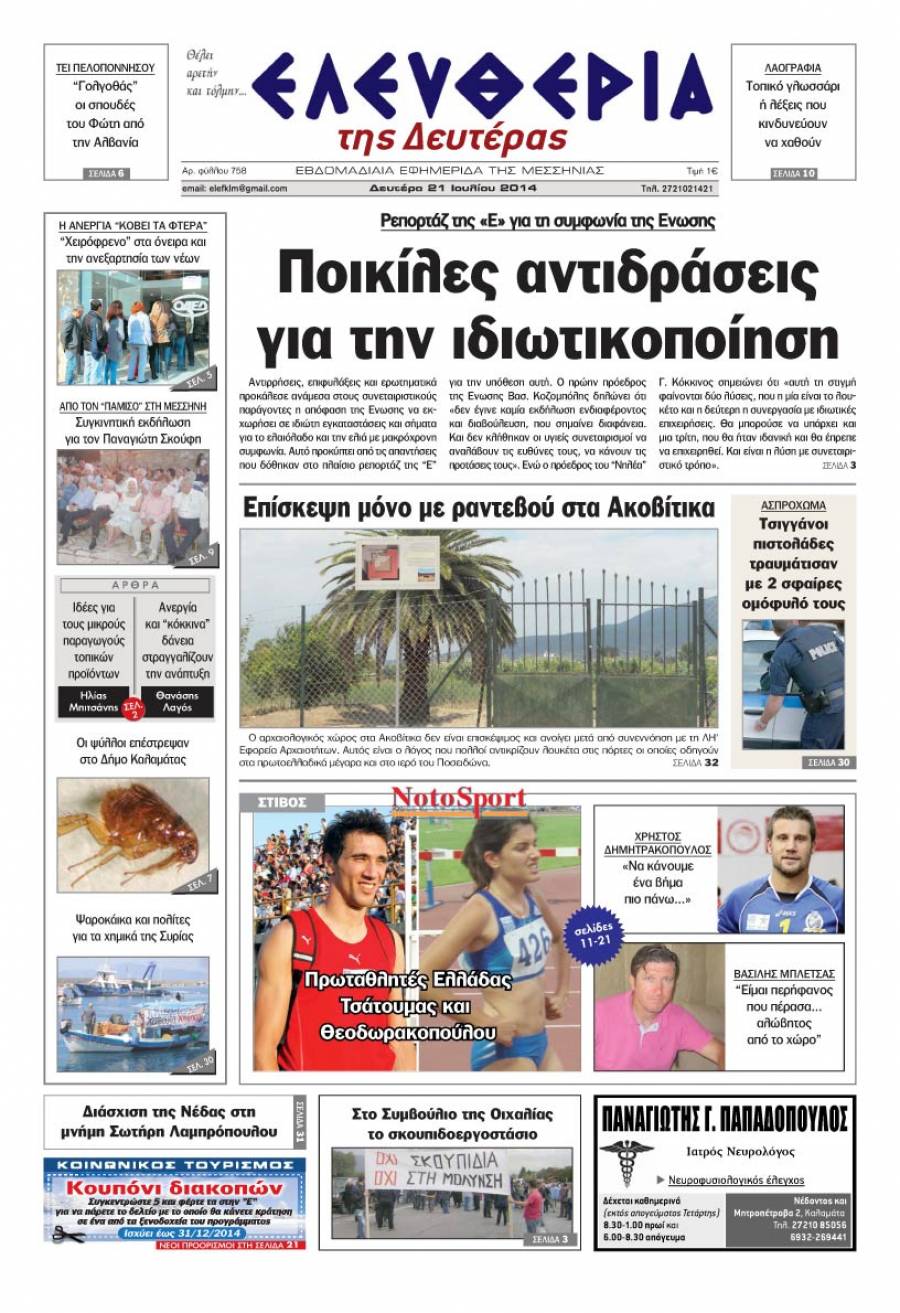 Το πρωτοσέλιδο της "Ελευθερίας" της Δευτέρας 21 Ιουλίου 2014 Για να κατεβάσετε το αρχείο πατήστε πάνω στο κουμπί που γράφει download pdf