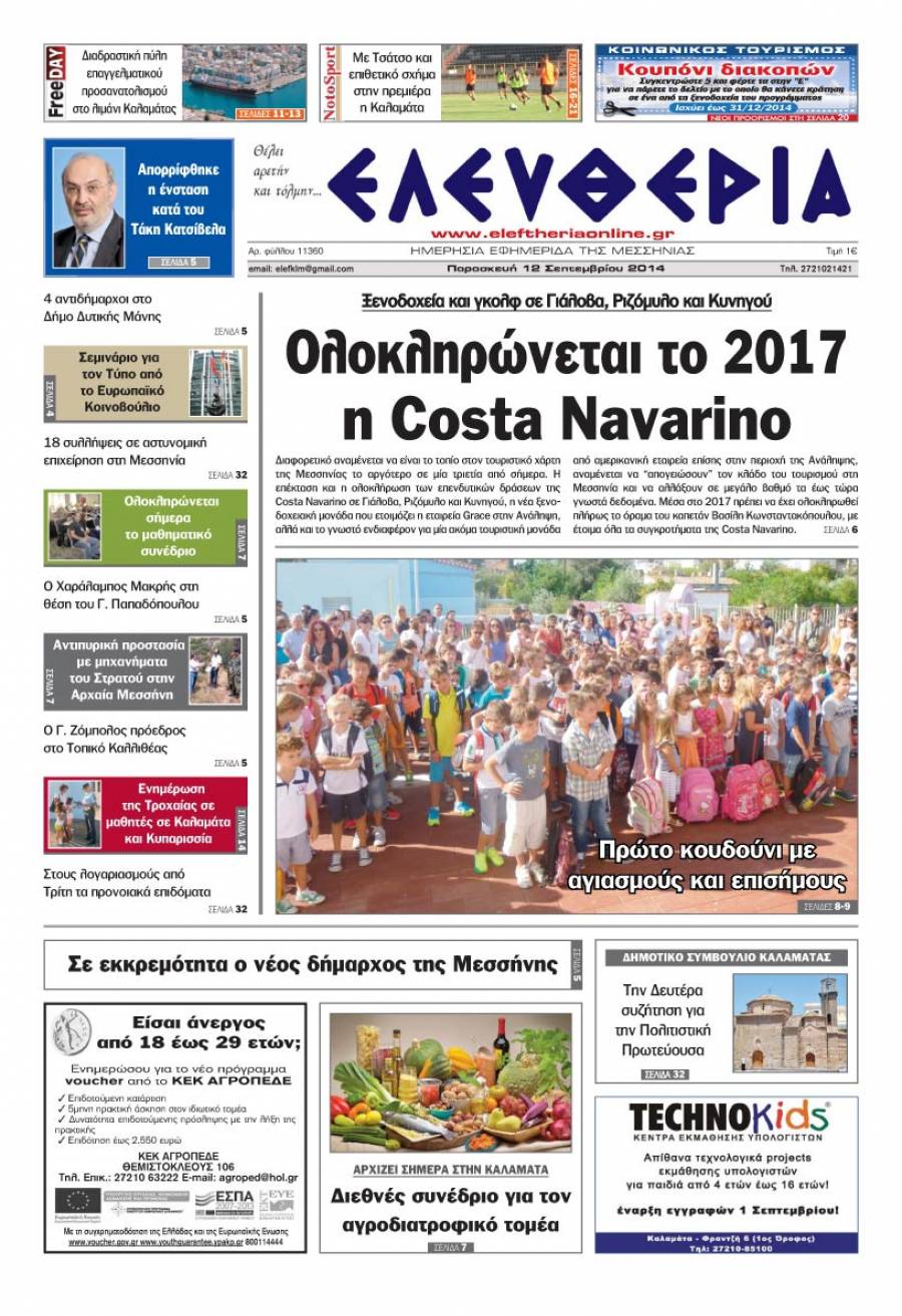 Το πρωτοσέλιδο της "Ελευθερίας" της Παρασκευής 12 Σεπτεμβρίου 2014 Για να κατεβάσετε το αρχείο πατήστε πάνω στο κουμπί που γράφει download pdf