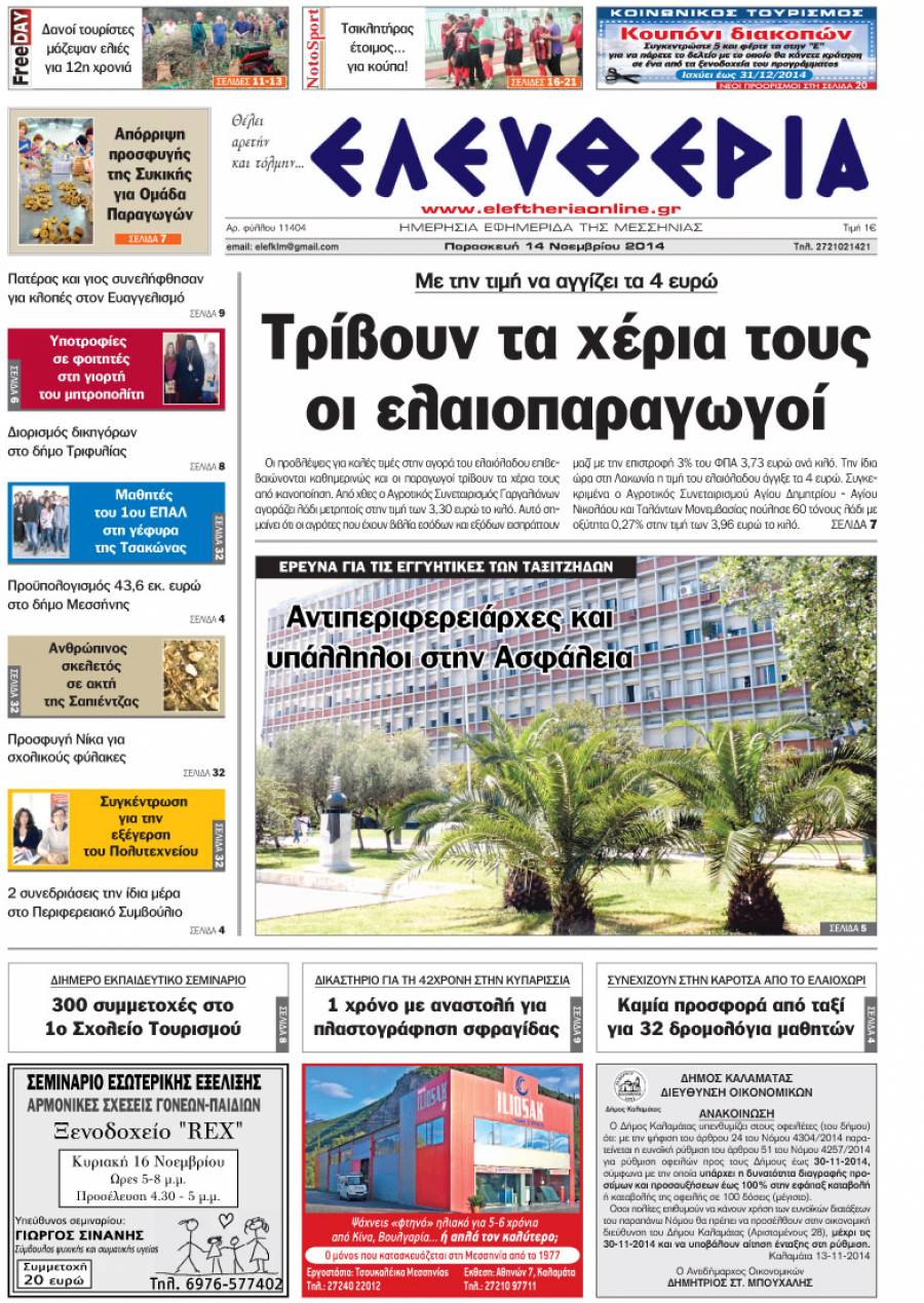 Το πρωτοσέλιδο της "Ελευθερίας" Παρασκευή 14 Νοεμβρίου 2014 Για να κατεβάσετε το αρχείο πατήστε πάνω στο κουμπί που γράφει download pdf