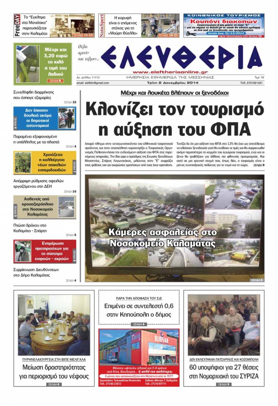 Το πρωτοσέλιδο της "Ελευθερίας" Τρίτη 2 Δεκεμβρίου 2014 Για να κατεβάσετε το αρχείο πατήστε πάνω στο κουμπί που γράφει download pdf