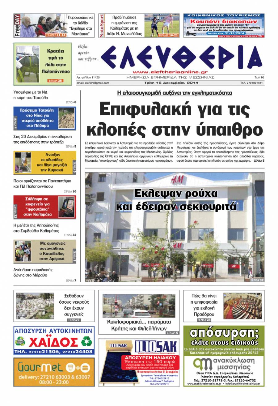 Το πρωτοσέλιδο της "Ελευθερίας" Τρίτη 16 Δεκεμβρίου 2014 Για να κατεβάσετε το αρχείο πατήστε πάνω στο κουμπί που γράφει download pdf