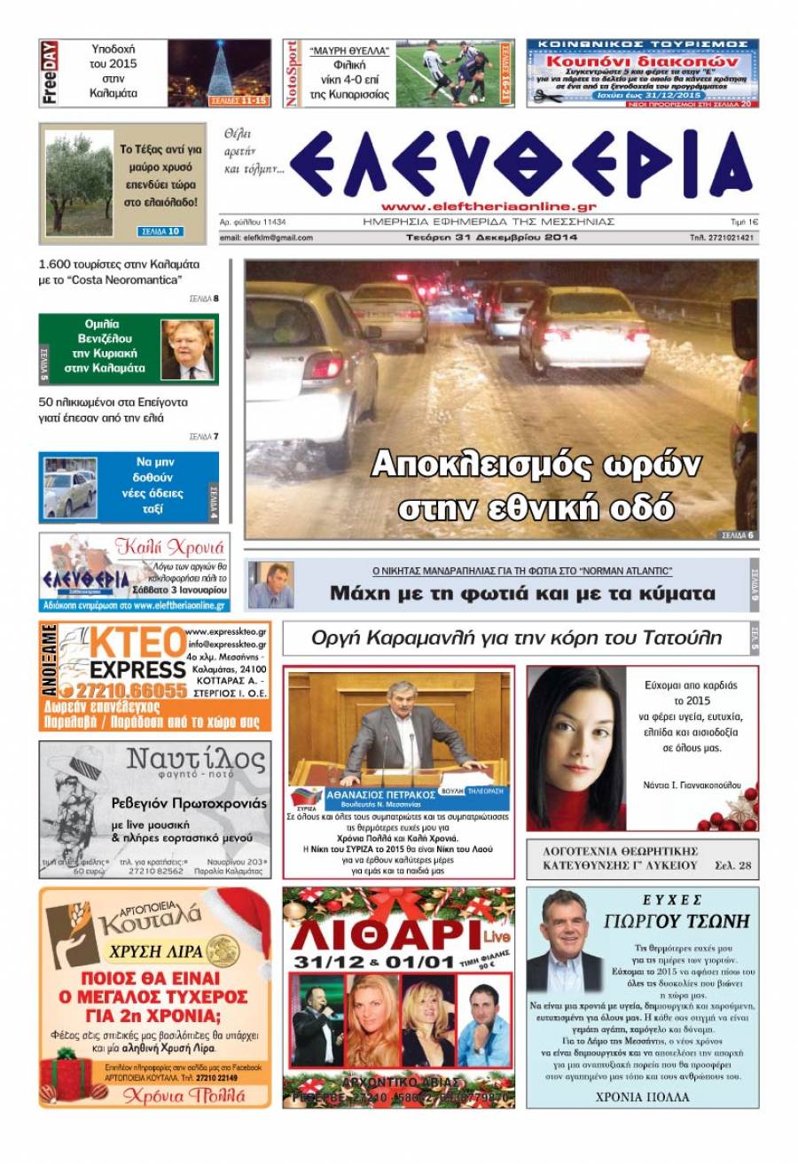 Το πρωτοσέλιδο της "Ελευθερίας" Τετάρτη 31 Δεκεμβρίου 2014 Για να κατεβάσετε το αρχείο πατήστε πάνω στο κουμπί που γράφει download pdf