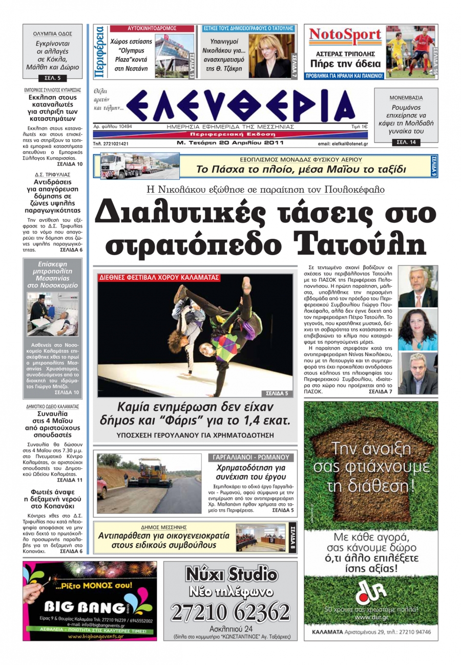 Το πρωτοσέλιδο της "Ελευθερίας" 20 04 2011 Για να κατεβάσετε το αρχείο πατήστε πάνω στο κουμπί που γράφει download pdf