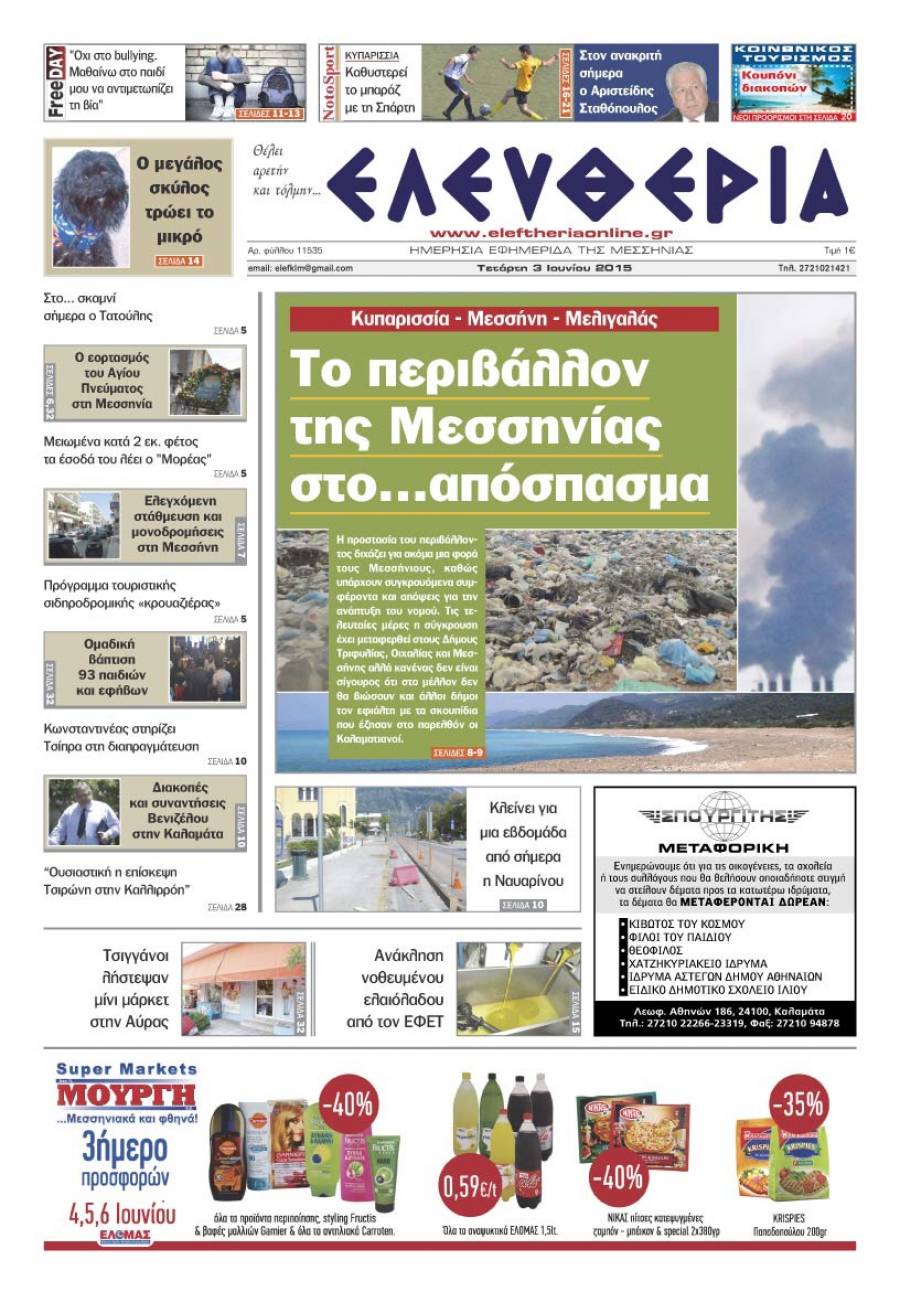 Το πρωτοσέλιδο της "Ελευθερίας" Τετάρτη 3 Ιουνίου 2015 Για να κατεβάσετε το αρχείο πατήστε πάνω στο κουμπί που γράφει download pdf