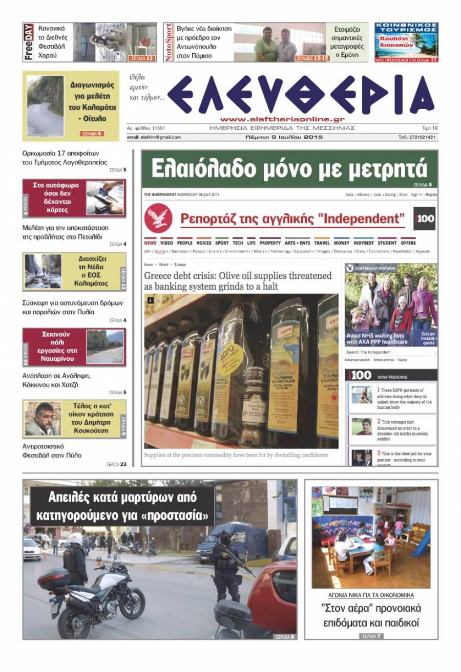 Το πρωτοσέλιδο της "Ελευθερίας" Πέμπτη 9 Iουλίου 2015 Για να κατεβάσετε το αρχείο πατήστε πάνω στο κουμπί που γράφει download pdf