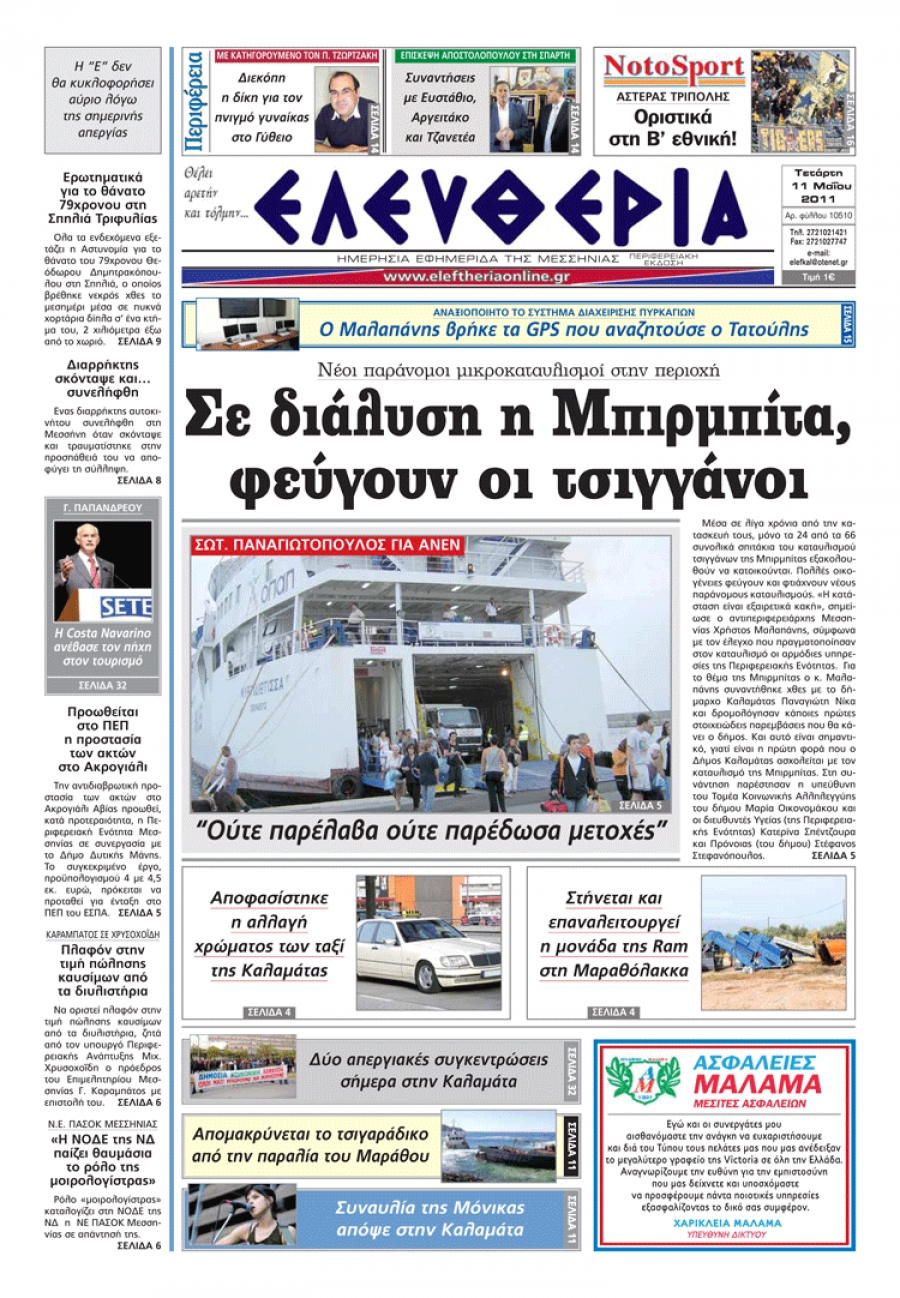 Το πρωτοσέλιδο της "Ελευθερίας" 11-5-2011 Για να κατεβάσετε το αρχείο πατήστε πάνω στο κουμπί που γράφει download pdf