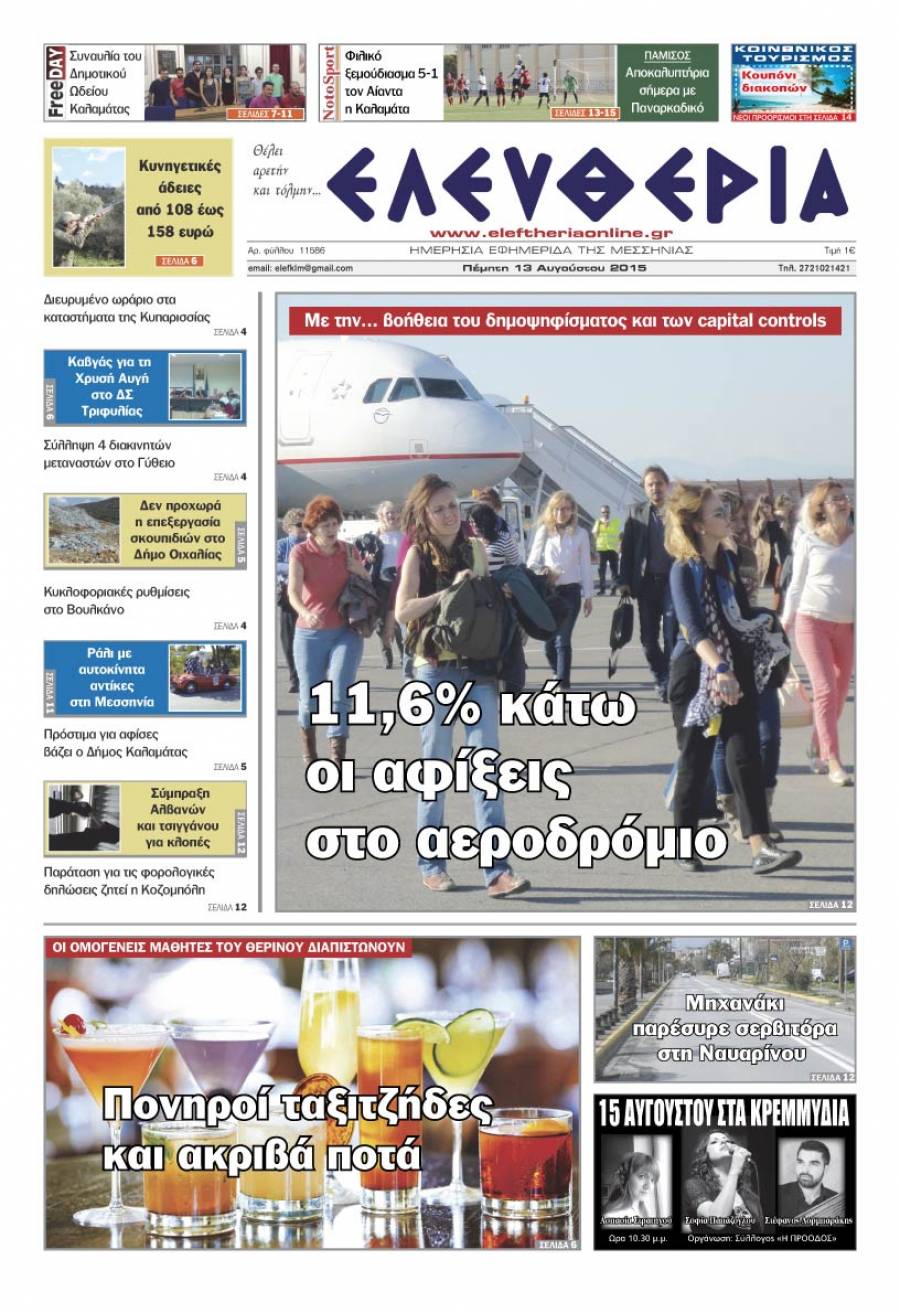 Το πρωτοσέλιδο της "Ελευθερίας" - Πέμπτη 13 Αυγούστου 2015 Για να κατεβάσετε το αρχείο πατήστε πάνω στο κουμπί που γράφει download pdf