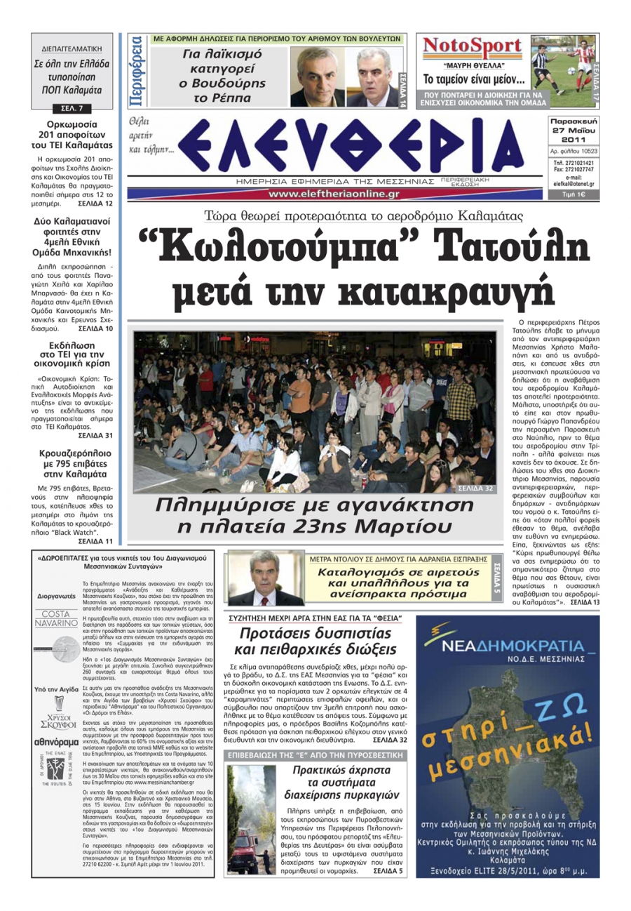 Το πρωτοσέλιδο της "Ελευθερίας" 27 05 2011 Για να κατεβάσετε το αρχείο πατήστε πάνω στο κουμπί που γράφει download pdf