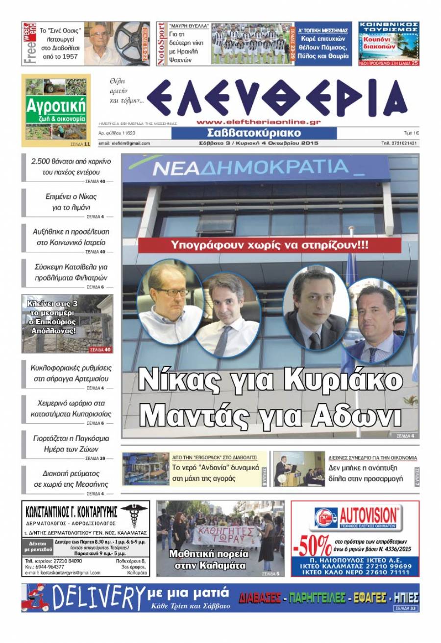 Το πρωτοσέλιδο της "Ελευθερίας Σαββατοκύριακο" - 3 και 4 Οκτωβρίου 2015 Για να κατεβάσετε το αρχείο πατήστε πάνω στο κουμπί που γράφει download pdf
