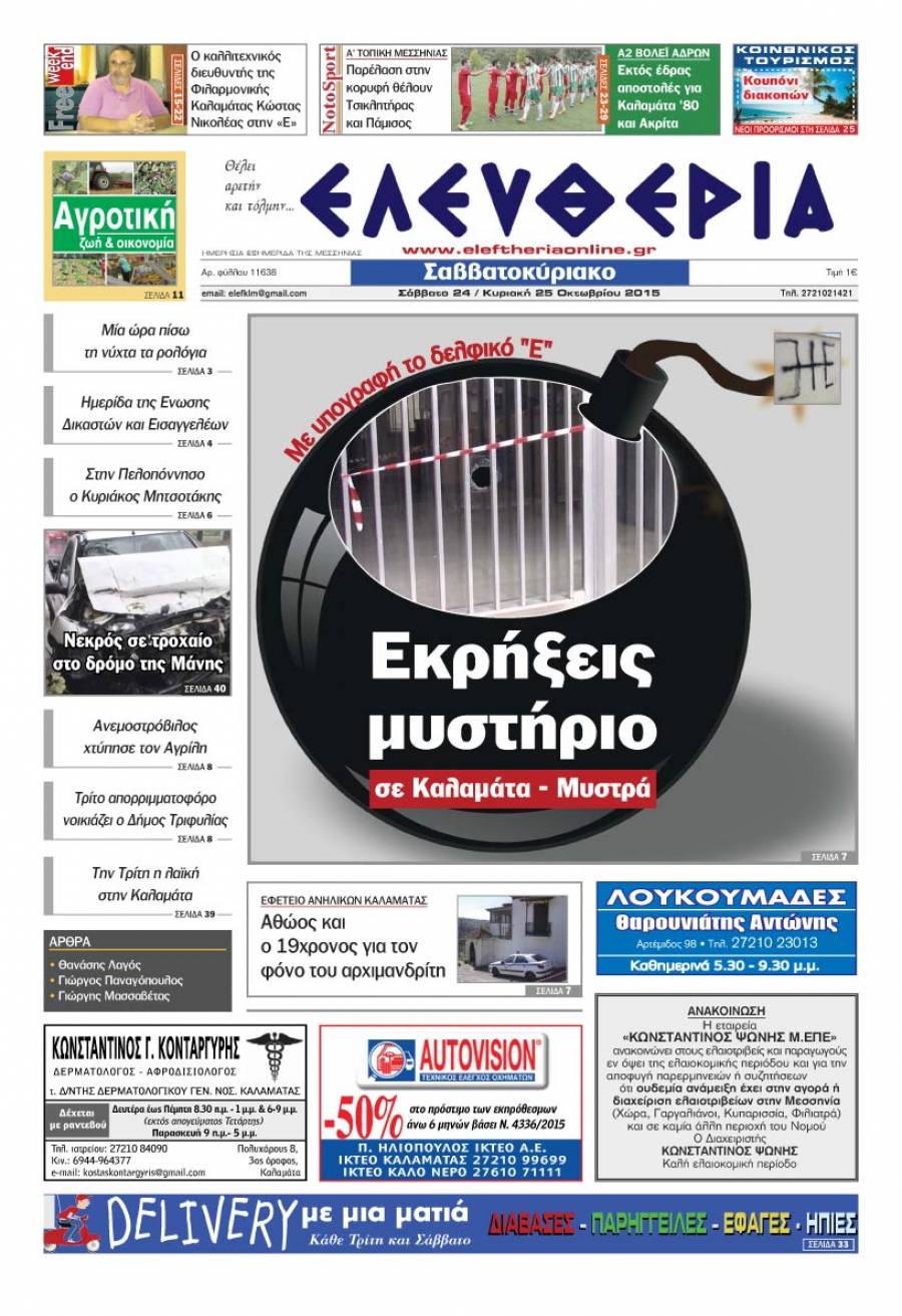 Το πρωτοσέλιδο της "Ελευθερίας Σαββατοκύριακο" 24-25 Οκτωβρίου 2015