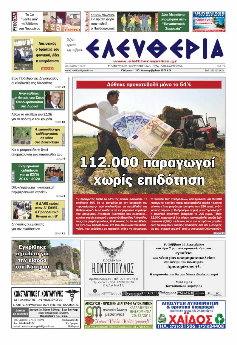 Το πρωτοσέλιδο της "Ελευθερίας" - Πέμπτη 10 Δεκεμβρίου 2015 Για να κατεβάσετε το αρχείο πατήστε πάνω στο κουμπί που γράφει download pdf