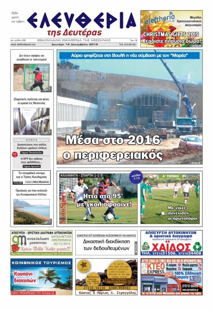 Το πρωτοσέλιδο της "Ελευθερίας της Δευτέρας" - 14 Δεκεμβρίου 2015
