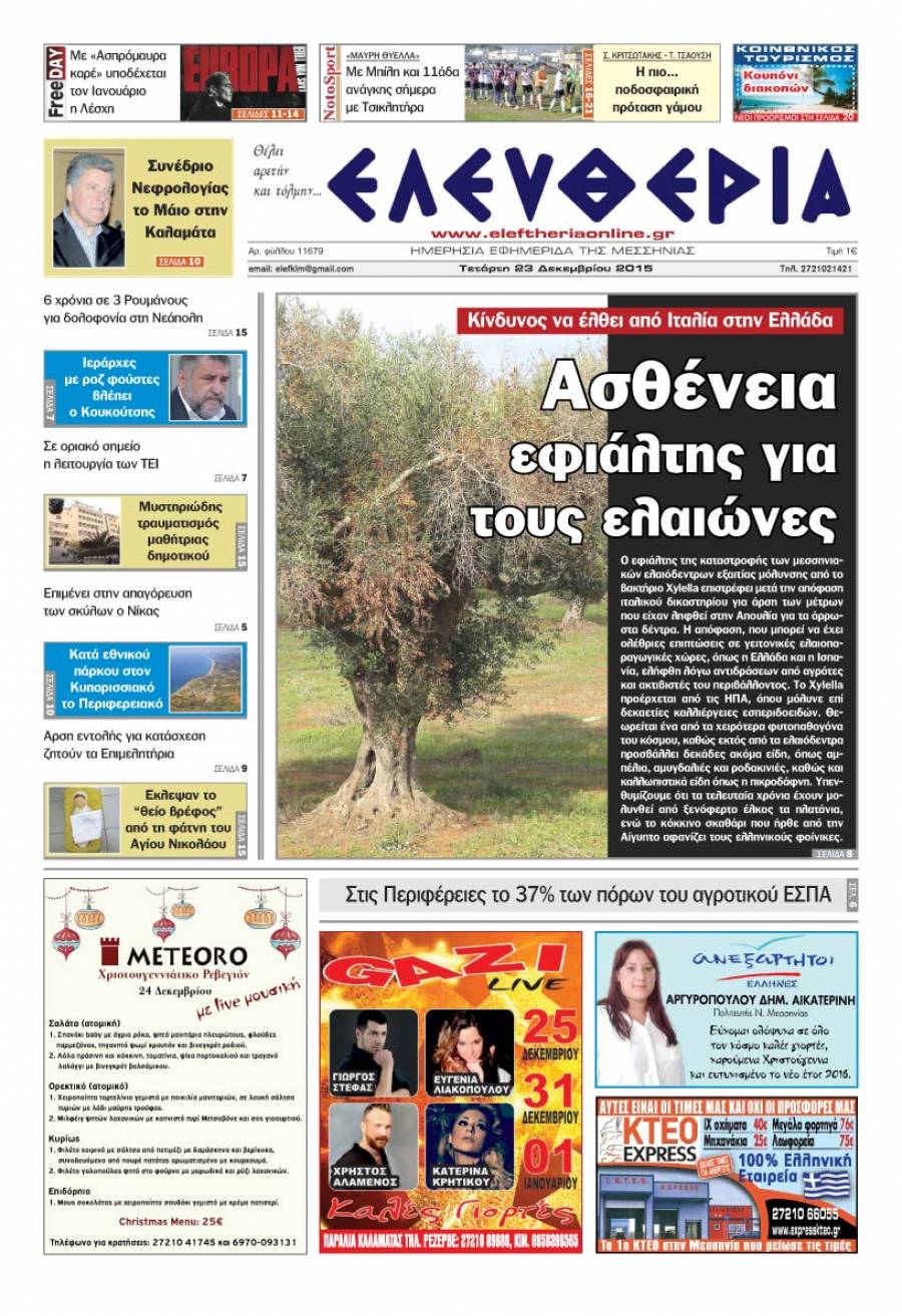 Το πρωτοσέλιδο της "Ελευθερίας" - Τετάρτη 23 Δεκεμβρίου 2015 Για να κατεβάσετε το αρχείο πατήστε πάνω στο κουμπί που γράφει download pdf