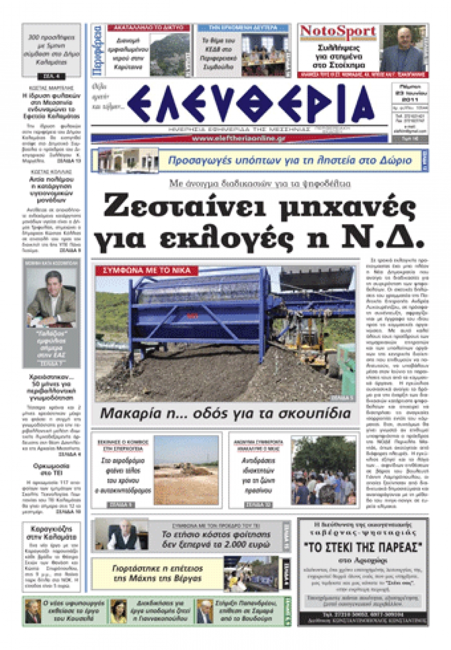 Το πρωτοσέλιδο της "Ελευθερίας" 23 06 2011 Για να κατεβάσετε το αρχείο πατήστε πάνω στο κουμπί που γράφει download pdf