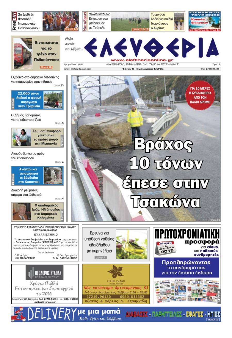 Το πρωτοσέλιδο της "Ελευθερίας" - Τρίτη 5 Ιανουαρίου 2016 Για να κατεβάσετε το αρχείο πατήστε πάνω στο κουμπί που γράφει download pdf