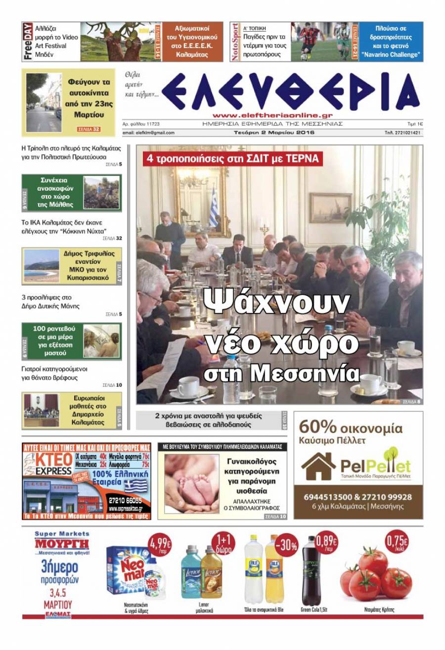 Το πρωτοσέλιδο της "Ελευθερίας" - Τετάρτη 2 Μαρτίου 2016 Για να κατεβάσετε το αρχείο πατήστε πάνω στο κουμπί που γράφει download pdf