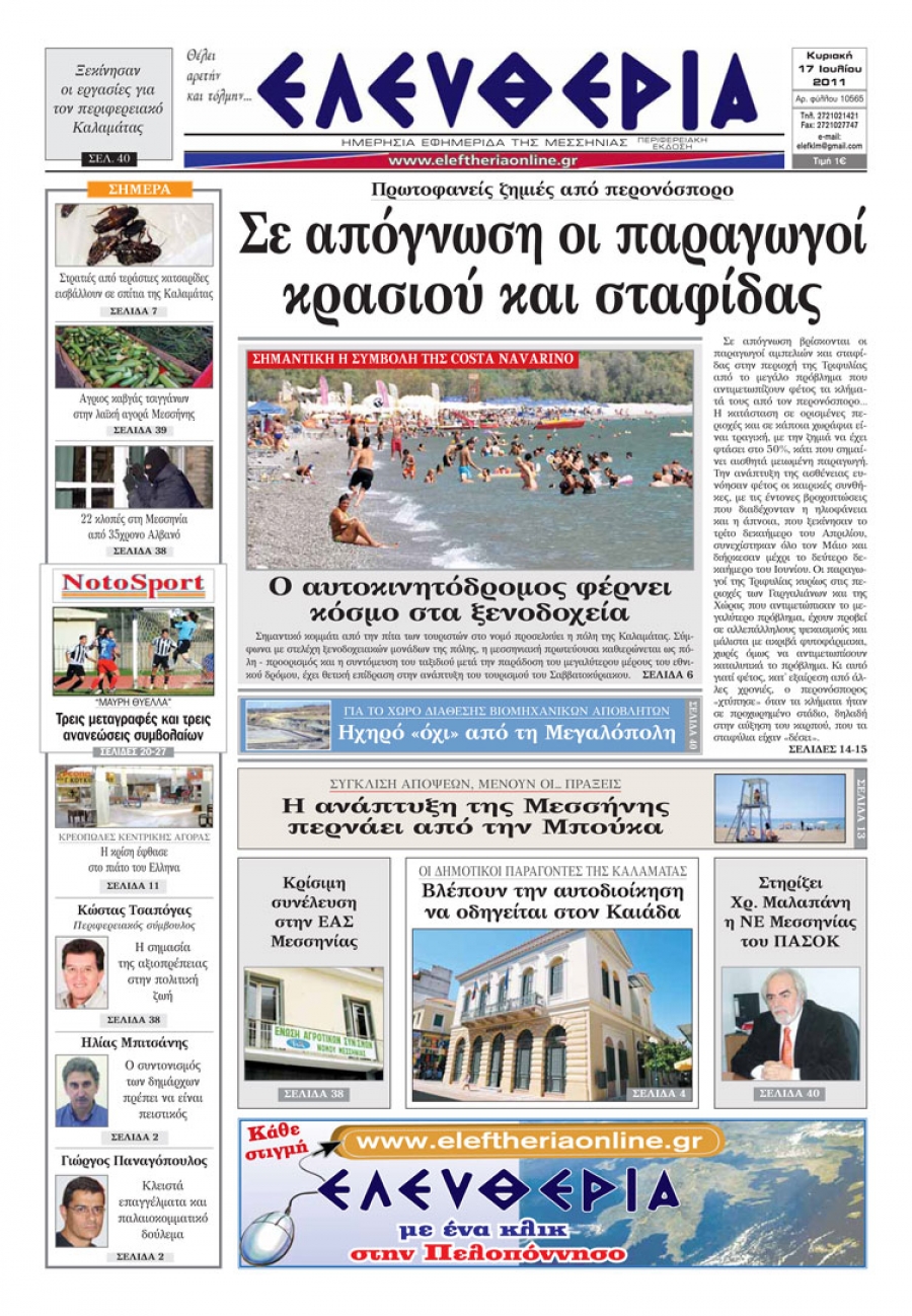 Το πρωτοσέλιδο της "Ελευθερίας" 17 Ιουλίου 2011 Για να κατεβάσετε το αρχείο πατήστε πάνω στο κουμπί που γράφει download pdf