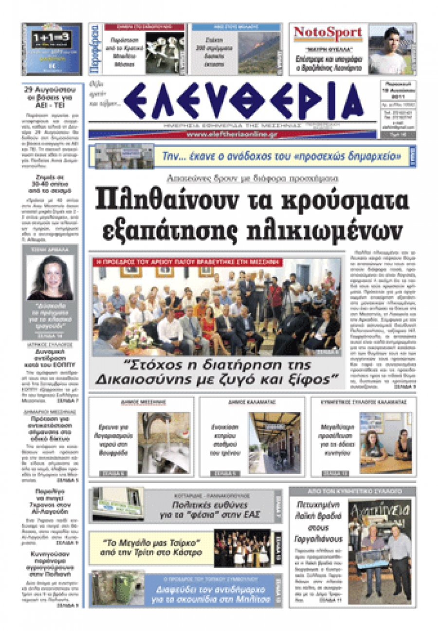 Το πρωτοσέλιδο της "Ελευθερίας" 19 08 2011 Για να κατεβάσετε το αρχείο πατήστε πάνω στο κουμπί που γράφει download pdf