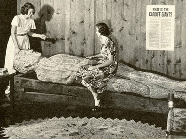 Ο George Hull ήταν ένας άθεος καπνοπώλης. Μία μέρα του 1868 σε μια θρησκευτική συγκέντρωση Μεθοδιστών διαφώνησε έντονα με έναν ιερέα για ένα εδάφιο στη Βίβλο, που ανέφερε ότι κάποτε στη γη υπήρχαν γίγαντες. Ο Hull προσπάθησε να τον πείσει ότι αυτό δεν είναι αλήθεια, αλλά ο ιερέας ήταν απόλυτος. Όταν γύρισε σπίτι του σκέφτηκε ένα τρόπο να εκδικηθεί τον παπά. Αποφάσισε να κατασκευάσει ένα τεράστιο άγαλμα ύψους τριών μέτρων και να το παρουσιάσει σαν έναν αληθινό απολιθωμένο γίγαντα.