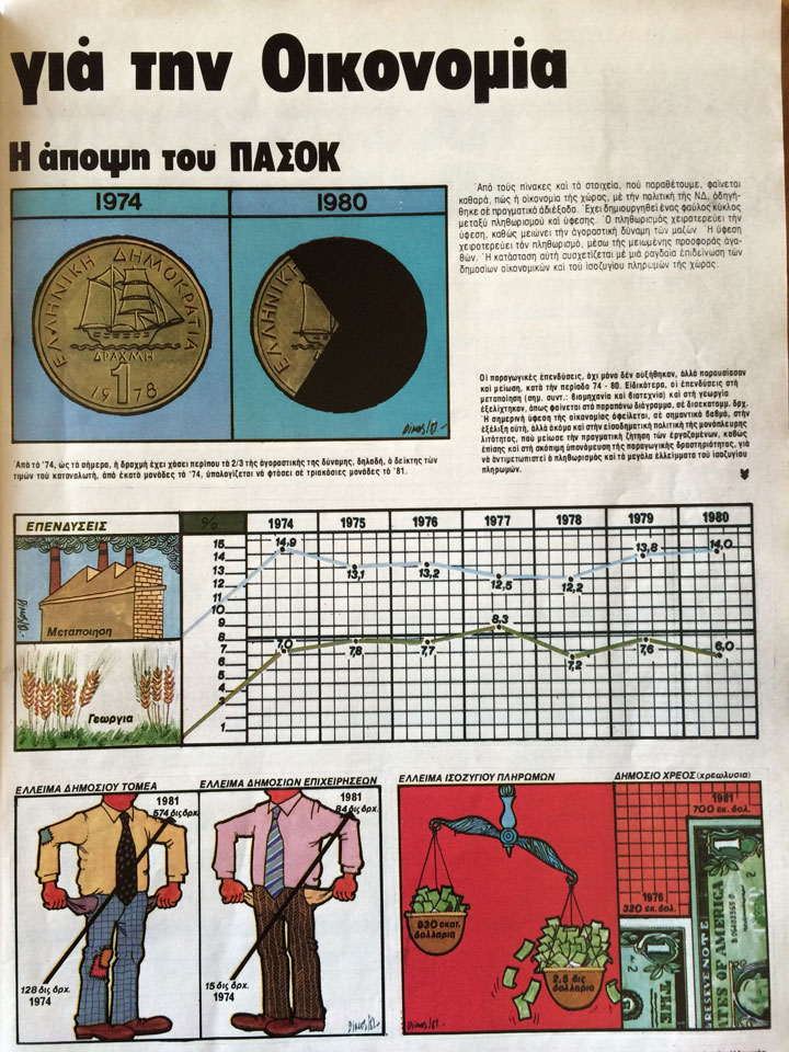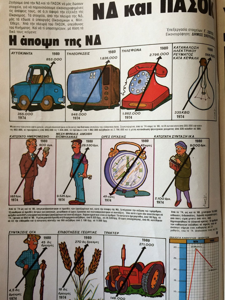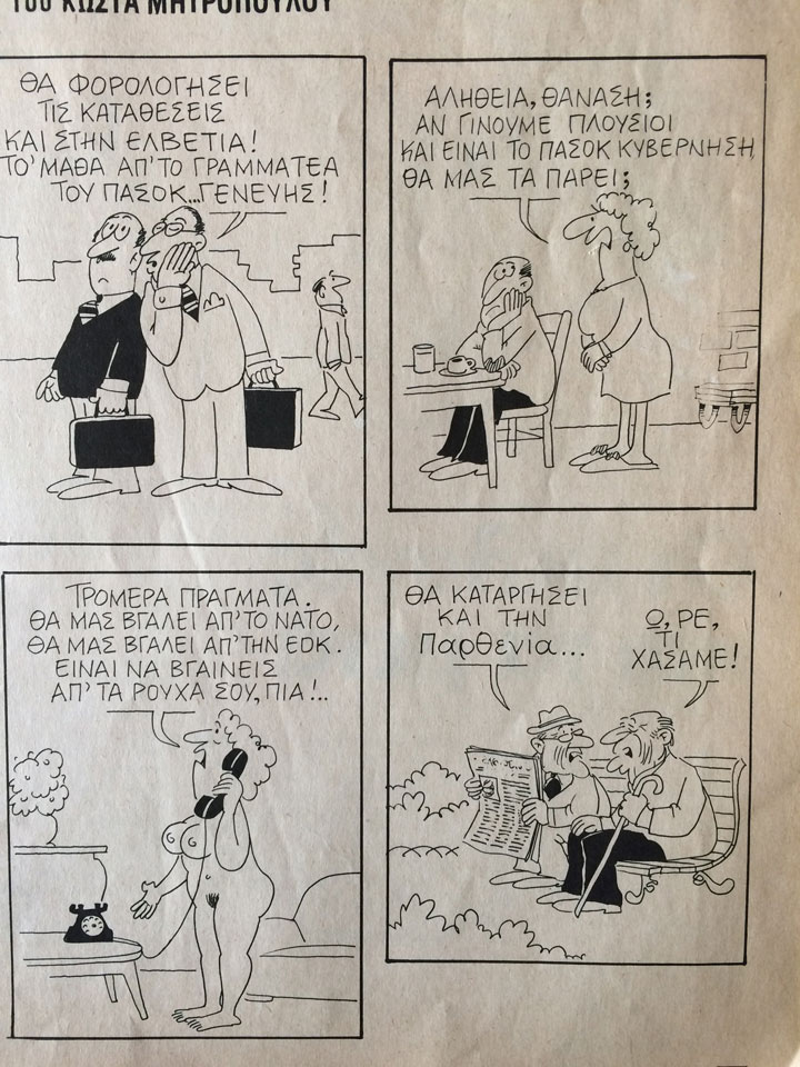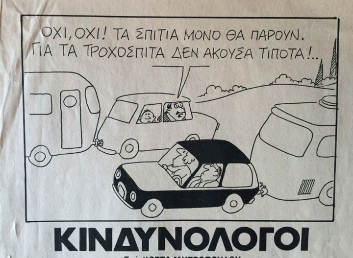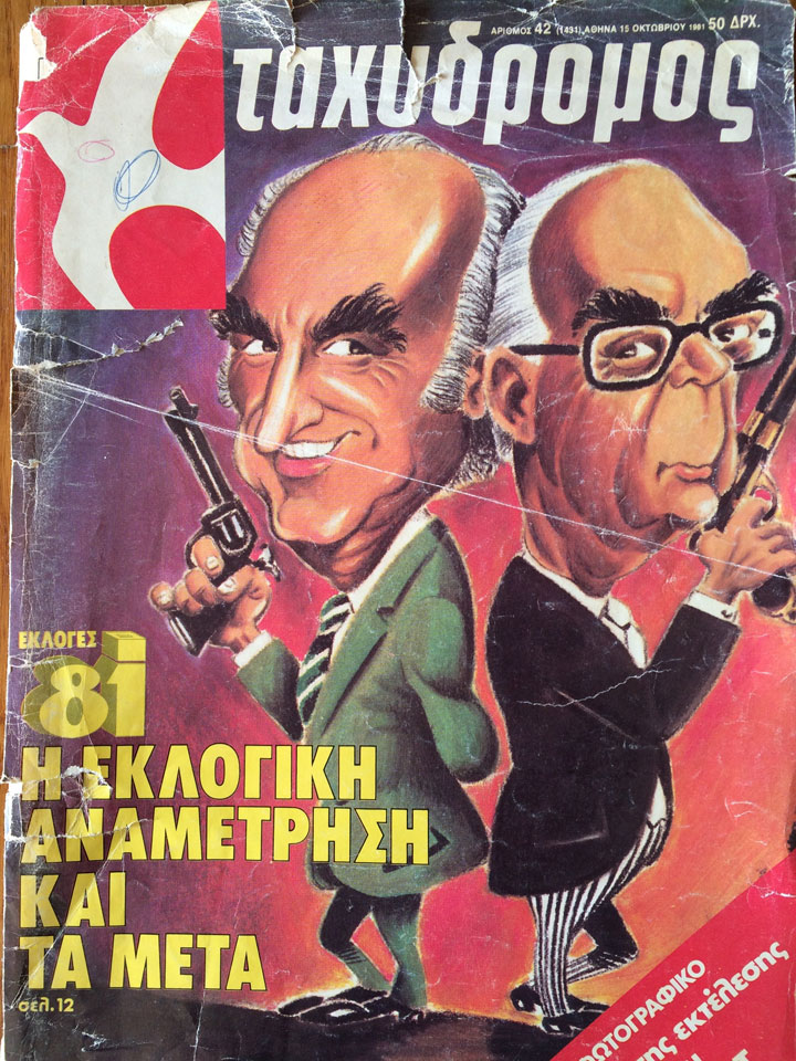 Μετά από χρόνια χούντας και δεξιάς oι φόβοι για την έξοδο από την ΕΟΚ και το ΝΑΤΟ είναι εμφανείς στο προεκλογικό κλίμα της εποχής. Γελοιογραφία του Κώστα Μητρόπουλου από τον Ταχυδρόμο. Κάτι μας θυμίζει, κάτι μας θυμίζει…
