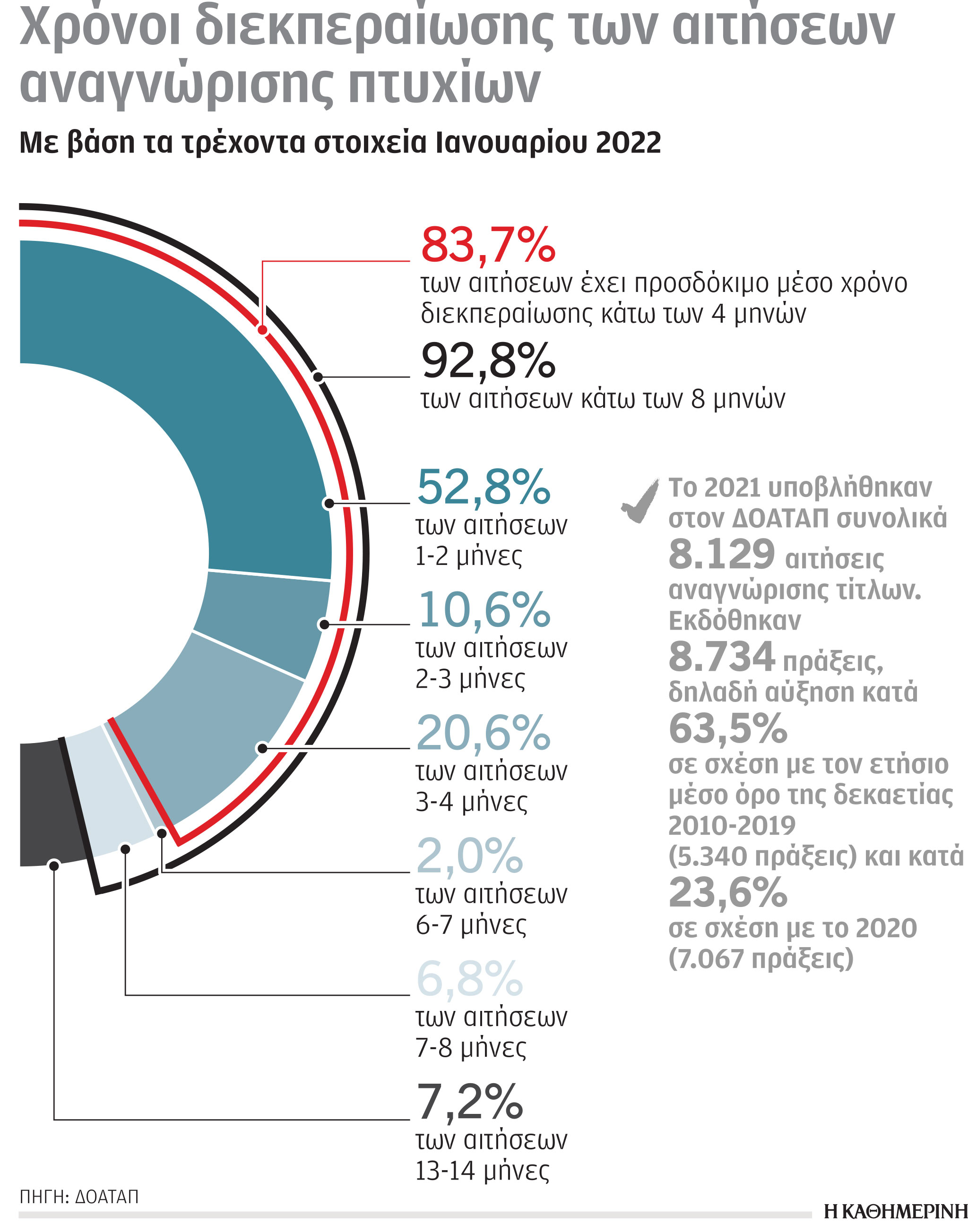 Χθες η διοίκηση του ΔΟΑΤΑΠ –πρόεδρος ο καθηγητής του ΑΠΘ Ορέστης Καλογήρου– παρουσίασε στοιχεία που δείχνουν τη βελτίωση των χρόνων στη διεκπεραίωση των αιτήσεων που έχουν φθάσει στον οργανισμό. Το 2021 υποβλήθηκαν στον ΔΟΑΤΑΠ συνολικά 8.129 αιτήσεις αναγνώρισης τίτλων. Οπως και το 2020, για δεύτερη συνεχόμενη χρονιά, το 2021, επιτεύχθηκε πλεόνασμα ολοκληρωμένων έναντι υποβληθεισών πράξεων (605 περισσότερες πράξεις), παρά τη μεγάλη αύξηση υποβληθεισών αιτήσεων κατά 18,4% σε σχέση με το 2020 (1.266 περισσότερες υποβληθείσες αιτήσεις το 2021).