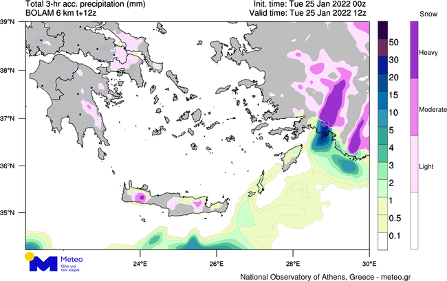 Στην παρακάτω Ομάδα Χαρτών του meteo, εμφανίζεται το εκτιμώμενο ύψος υετού ανά τρίωρο (μωβ αποχρώσεις χιόνι και μπλε αποχρώσεις βροχή/χιονόνερο), όπως υπολογίζεται από το αριθμητικό μοντέλο πρόγνωσης καιρού του Εθνικού Αστεροσκοπείου Αθηνών / Meteo.gr, για επιλεγμένα τρίωρα της Τρίτης 25/01/2022.