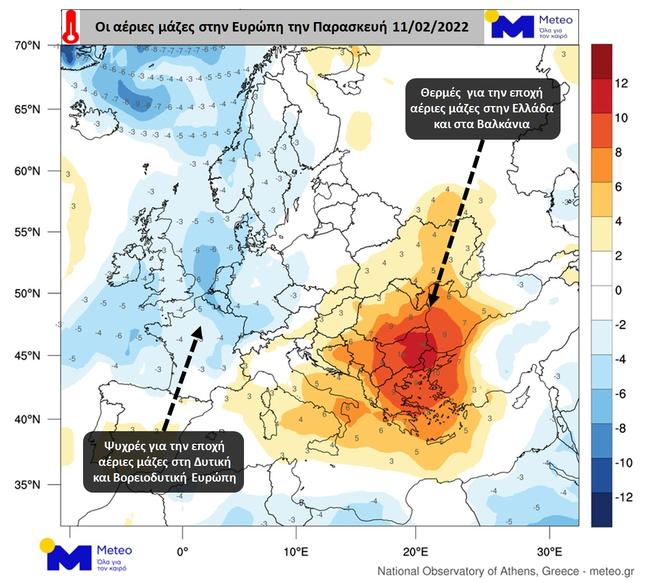 Σύμφωνα με το Meteo, τα προγνωστικά στοιχεία αναφέρουν ότι την Παρασκευή 11 Φεβρουαρίου, η θερμοκρασία θα σημειώσει περαιτέρω άνοδο, με τις αέριες μάζες να είναι έως και 10 βαθμούς θερμότερες σε σχέση με τα φυσιολογικά για την εποχή επίπεδα.