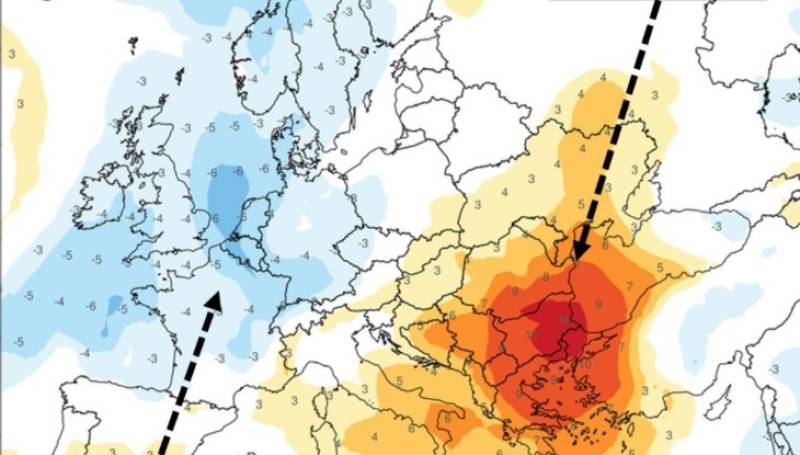 Ακολουθεί χάρτης που αποτυπώνει στο σύνολο της Ευρώπης, την απόκλιση των θερμοκρασιών από τη μέση κλιματική τους τιμή στο επίπεδο των 850 hPa, δηλαδή σε ύψος περίπου 1500 μέτρων: