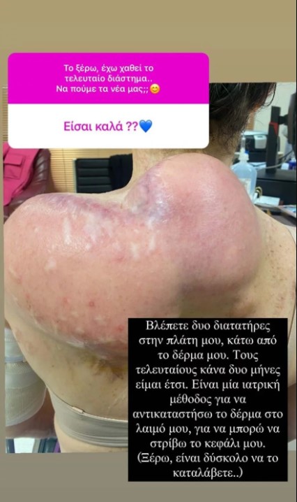 Όπως εξήγησε, ο λόγος που απείχε ήταν επειδή ακολουθεί μία αρκετά δύσκολη ιατρική μέθοδο, προκειμένου να αποκαταστήσει το δέρμα στον λαιμό της και να μπορεί να έχει πλήρη κίνηση στο κεφάλι της.