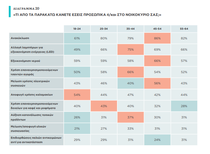 Οι δημοφιλέστερες πρακτικές καθημερινής ενεργοποίησης των γυναικών για το περιβάλλον είναι κινήσεις που συνεπάγονται και έναν θετικό αντίκτυπο για τον προσωπικό ή οικογενειακό προϋπολογισμό τους, όπως η ανακύκλωση, η αλλαγή λαμπτήρων για εξοικονόμηση ενέργειας, η εξοικονόμηση νερού, η χρήση επαναχρησιμοποιούμενων τσαντών αγοράς και η μείωση χρήσης ηλεκτρικών συσκευών. Χαρακτηριστική είναι, ωστόσο, η χαμηλή υιοθέτηση από πλευράς τους πρακτικών που απαιτούν σημαντική οικονομική επένδυση ή αλλάζουν σημαντικά τις καθημερινές συνήθειές τους.