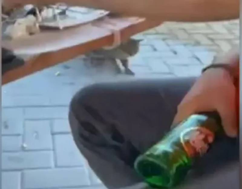 Όταν το τετράποδο πλησιάζει και τρώει τον μεζέ ο άνδρας τη χτυπά στο κεφάλι. Στο βίντεο ακούγονται και οι φίλοι του «πρωταγωνιστή» γελάνε με την κακοποίηση του ζώου.
