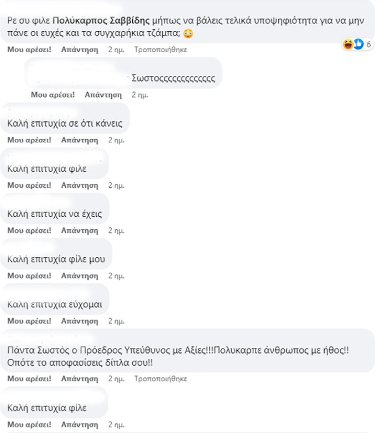 Παραδόξως, στη συνέχεια έγινε δέκτης εκατοντάδων ευχών για καλή επιτυχία στον προεκλογικό του αγώνα από διαδικτυακούς φίλους του στο Facebook, που πιθανόν από κεκτημένη ταχύτητα και μέσα στον βομβαρδισμό των υποψηφιοτήτων αυτής της περιόδου, είδαν ανάρτηση πολιτικού περιεχομένου και έσπευσαν καλοπροαίρετα να ευχηθούν, αναφέρει το e-ptolemeos.gr.