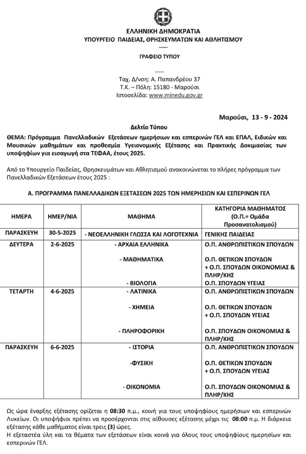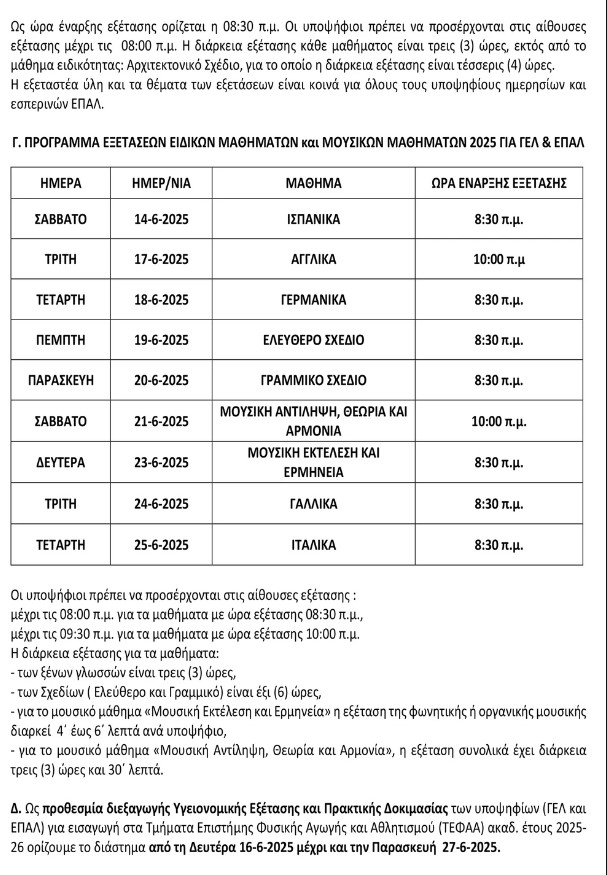 Οι εξετάσεις των ειδικών μαθημάτων θα πραγματοποιηθούν κατά το διάστημα 14-25 Ιουνίου 2025, ενώ προθεσμία διεξαγωγής της Υγειονομικής Εξέτασης και Πρακτικής Δοκιμασίας των υποψηφίων (ΓΕΛ και ΕΠΑΛ) για εισαγωγή στα Τμήματα Επιστήμης Φυσικής Αγωγής και Αθλητισμού (ΤΕΦΑΑ) ορίστηκε το διάστημα από τη Δευτέρα 16-6-2025 μέχρι και την Παρασκευή 27-6-2025.