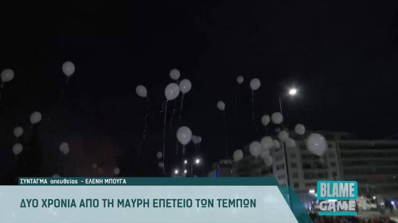 Στις 23:18 το βράδυ της Παρασκευής, μετά τα μεγαλειώδη συλλαλητήρια για τη συμπλήρωση δύο χρόνων από την μαύρη επέτειο των Τεμπών, πλήθος συγκεντρωμένο έξω από τη Βουλή στο Σύνταγμα, αφήνει 57 μπαλόνια με τις ηλικίες και τα ονόματα των νεκρών να φύγουν στον αττικό ουρανό.