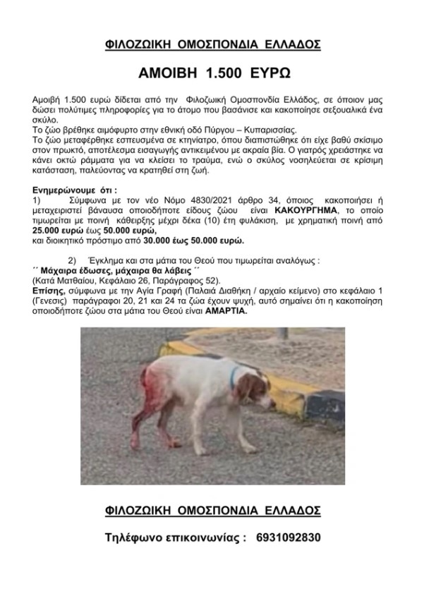 Πρόκειται για το σκύλο που βρέθηκε από εθελοντές της Φιλοζωικής Κρεστένων «Νοιάζομαι» την Τετάρτη (22/10) στην Εθνική Οδό Πύργου – Κυπαρισσίας, στο ύψος του χωριού Επιτάλιο σε τραγική κατάσταση, με ακατάσχετη αιμορραγία.