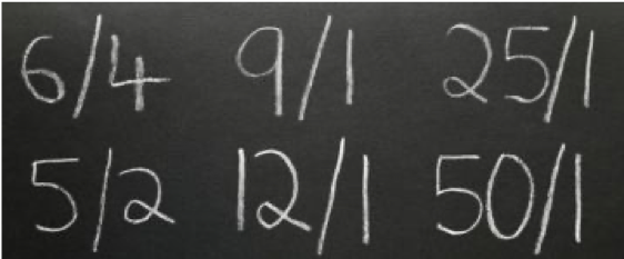 100/1.90 = 52,6% | 100/3.40 = 29,4% | 100/4.70 = 21,2%
