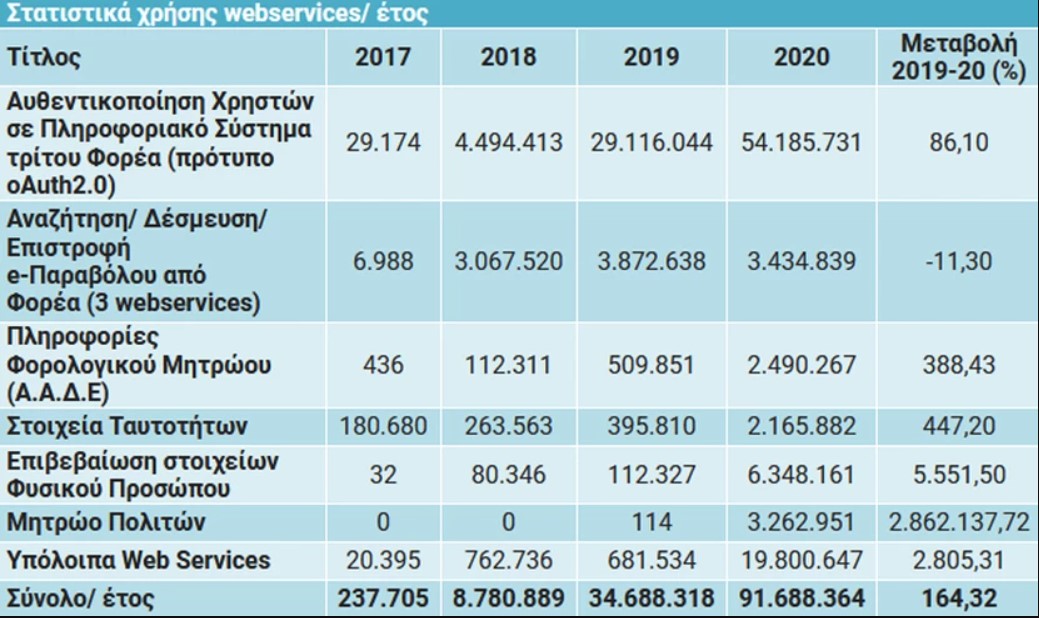 Επιπλέον, το προηγούμενο έτος σημειώθηκε μεγάλη ανάπτυξη στις υπηρεσίες που επιτρέπουν στα συστήματα του Δημοσίου να ανταλλάσσουν μεταξύ τους πληροφορίες. Με την πλήρη αξιοποίηση του Κέντρου Διαλειτουργικότητας της ΓΓΠΣΔΔ, οι συγκεκριμένες υπηρεσίες πραγματοποίησαν 37.000.000 ανταλλαγές δεδομένων μεταξύ των υπηρεσιών του Δημοσίου χωρίς να απαιτείται η διαμεσολάβηση των πολιτών. Σημειώθηκαν έτσι οκταπλάσιες ανταλλαγές συγκριτικά με το 2018, ενώ καταγράφηκε αύξηση 570% σε σχέση με το 2019, όπου ο αντίστοιχος αριθμός ανερχόταν στα 5.000.000. Οι συγκεκριμένες κλήσεις για ανταλλαγές δεδομένων αφορούσαν πληροφορίες όπως: