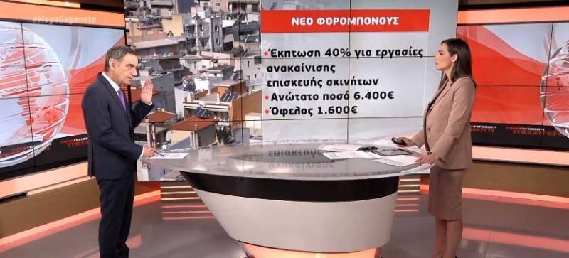 Παράλληλα, εκπτώσεις φόρου 40% αναμένονται για ανακαινίσεις και επισκευές ακινήτων. Ανώτατο ποσό θα είναι τα 6.400 ευρώ, ενώ ανάλογα με την κλίμακα ο φορολογούμενος μπορεί να έχει όφελος έως 1.600 ευρώ.
