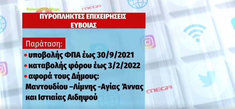 Παράταση για την υποβολή των δηλώσεων ΦΠΑ του Αυγούστου έως και την 30ή Σεπτεμβρίου 2021 δίνεται σε όσους έχουν την έδρα της επιχειρηματικής τους δραστηριότητας στους Δήμους Μαντουδίου - Λίμνης - Αγίας Άννας και Ιστιαίας Αιδηψού της Περιφερειακής Ενότητας Ευβοίας, της Περιφέρειας Στερεάς Ελλάδας.