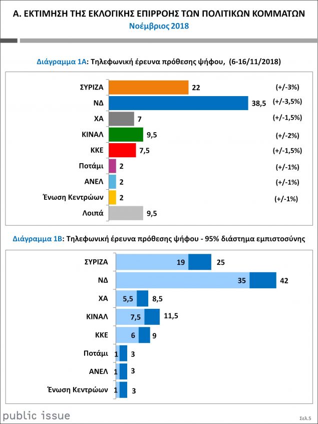 Σύμφωνα με την εν λόγω δημοσκόπηση, που διενεργήθηκε στο διάστημα από 6 έως 11 Νοεμβρίου, η Νέα Δημοκρατία συγκεντρώνει ποσοστό 38,5%, έναντι 22% του ΣΥΡΙΖΑ.