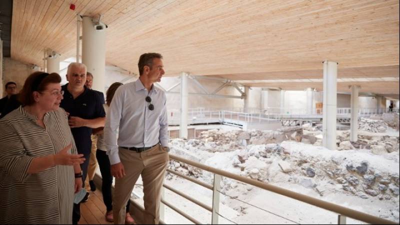 Στον εμβληματικό αρχαιολογικό χώρο ο πρωθυπουργός ξεναγήθηκε από την υπουργό Πολιτισμού και Αθλητισμού Λίνα Μενδώνη και είχε την ευκαιρία να θαυμάσει τα αρχαιολογικά ευρήματα τα οποία μαρτυρούν ότι το Ακρωτήρι συγκαταλεγόταν στους σημαντικότερους οικισμούς στο Αιγαίο Πέλαγος κατά την προϊστορική περίοδο, ενώ την εποχή του χαλκού ήκμασε σε μεγάλο αστικό κέντρο με λιμάνι.