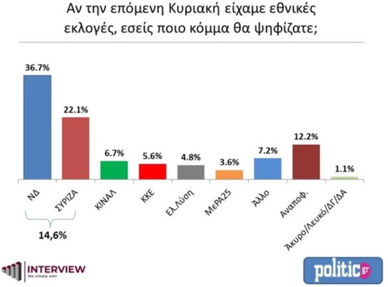 Η ΝΔ συγκεντρώνει το 36,7% της προτίμησης των ερωτηθέντων, ο ΣΥΡΙΖΑ το 22,1%, ενώ το ΚΙΝΑΛ το 6,7% και εδραιώνεται στην τρίτη θέση. Ακολουθεί το ΚΚΕ με 5,6% και η Ελληνική Λύση με 4,8%.