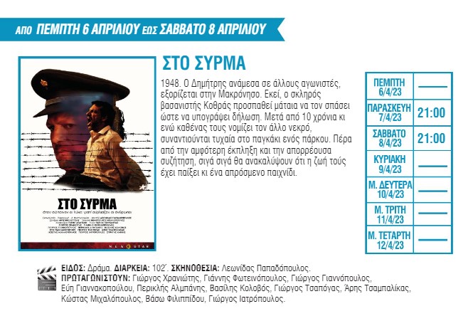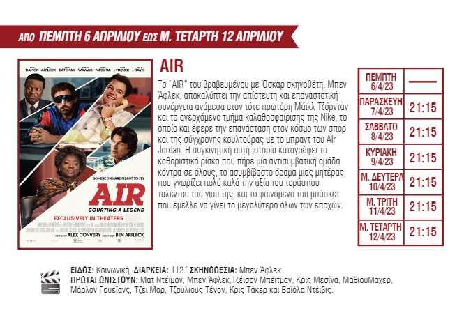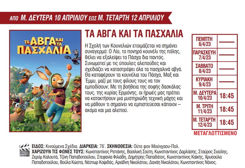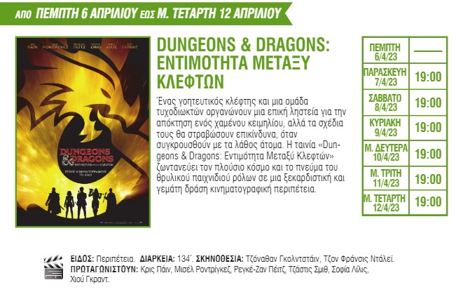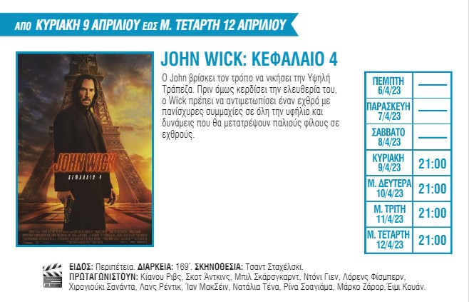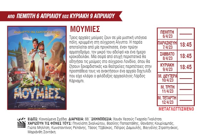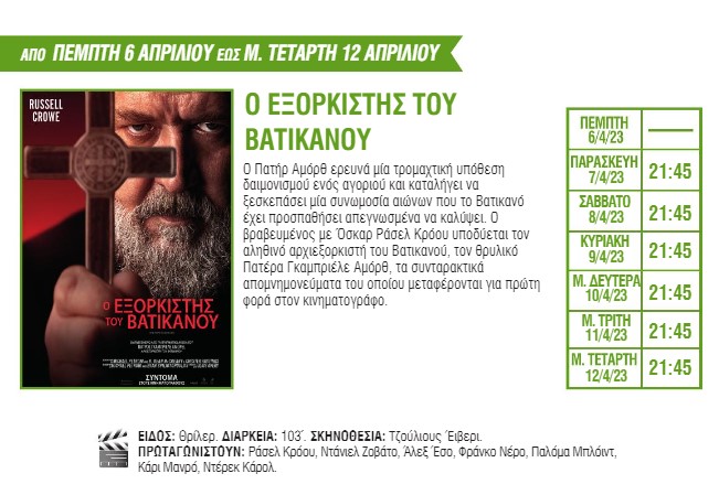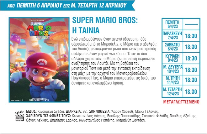 Για πρώτη φορά στη μεγάλη οθόνη θα προβληθούν οι ταινίες «The Super Mario Bros. Movie» με πρωταγωνιστή έναν από τους πιο διάσημους υδραυλικούς των τελευταίων δεκαετιών, «Ο Εξορκιστής του Βατικανού», μια νέα ταινία τρόμου με τον Ράσελ Κρόου, και το «Air» με τους Μπεν Άφλεκ και Ματ Ντέιμον. Το πρόγραμμα συμπληρώνουν οι ταινίες «Στο σύρμα», «John Wick: Κεφάλαιο 4», «Dungeons & Dragons: Εντιμότητα μεταξύ κλεφτών», «Τα αβγά και τα πασχάλια» και «Μούμιες».