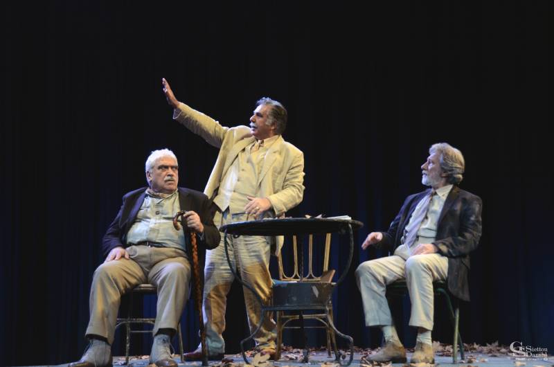 Το Ήρωες είναι εντός εισαγωγικών γιατί δεν φέρνουμε τίποτε ηρωικό, αντιθέτως φέρνουμε το βιολογικό μας τέλος. Είμαστε τρεις κουρασμένοι άνθρωποι, βετεράνοι του πολέμου, γκρινιάρηδες, οι οποίοι πλήττουν αφάνταστα σ΄ έναν οίκο ευγηρίας και αναπαριστούν τα οποιαδήποτε κατορθώματά τους ή τις ερωτικές τους «επιτυχίες» και προσπαθούν με κάθε τρόπο να επιβιώσουν με πολύ χιούμορ και στέλνοντας αισιόδοξα μηνύματα! Μετά τις παραστάσεις συχνά έρχονται συνταξιούχοι και μας λένε πως τους θυμίζουμε τα δικά τους καφενεία όπου συζητούν με τους φίλους τους.