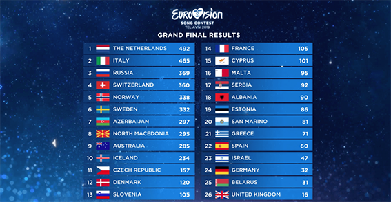 O Duncan Laurence με το τραγούδι "Arcade" έδωσε την 1η θέση της Eurovision 2019 στην Ολλανδία με 492 βαθμούς.