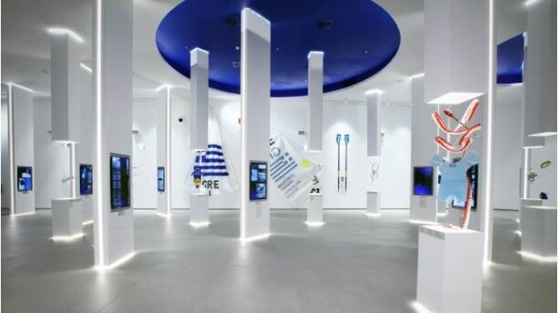 Η μεγάλη αίθουσα με τα αυθεντικά κοστούμια των Ολυμπιακών της Αθήνας του 2004, το μαγιό, η ζώνη και τα παπούτσια άρσης βαρών του Πύρρου Δήμα από το 1992 στην Βαρκελώνη, τα μετάλια αλλά και οι άδειες προθήκες που περιμένουν να υποδεχτούν τα επόμενα, μας μεταφέρουν με αμεσότητα στο σήμερα.