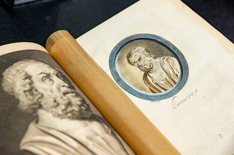 Η πρώτη από τις τρεις διαδοχικές εκδόσεις των ομηρικών επών από τον Ιταλό Ουμανιστή τυπογράφο Άλδο Μανούτιο που τυπώθηκε στη Βενετία το 1504. Η συντομευμένη νεοελληνική παράφραση της Ιλιάδας από τον Νικόλαο Λουκάνη που τυπώθηκε στη Βενετία το 1526 και κοσμείται από υπέροχες ξυλογραφίες. Οι εντυπωσιακές εικονογραφημένες εκδόσεις του Flaxman.