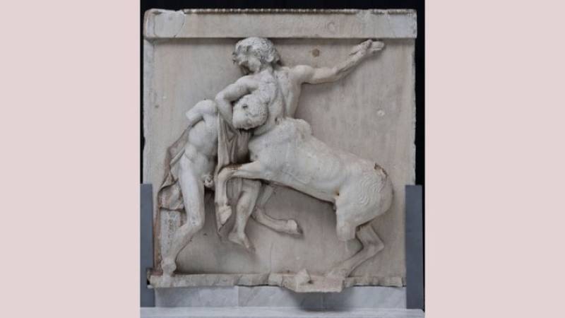 Για τον μύθο επιλέχθηκε μια από τις μετόπες της νότιας πλευράς του Παρθενώνα, που έχουν ως κύριο θέμα την Κενταυρομαχία: https://www.theacropolismuseum.gr/parthenonas-notia-metopi-1